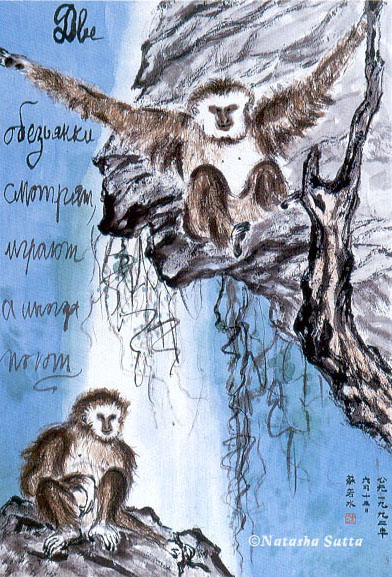 (Russian text) Two monkeys look, play and sometimes even sing